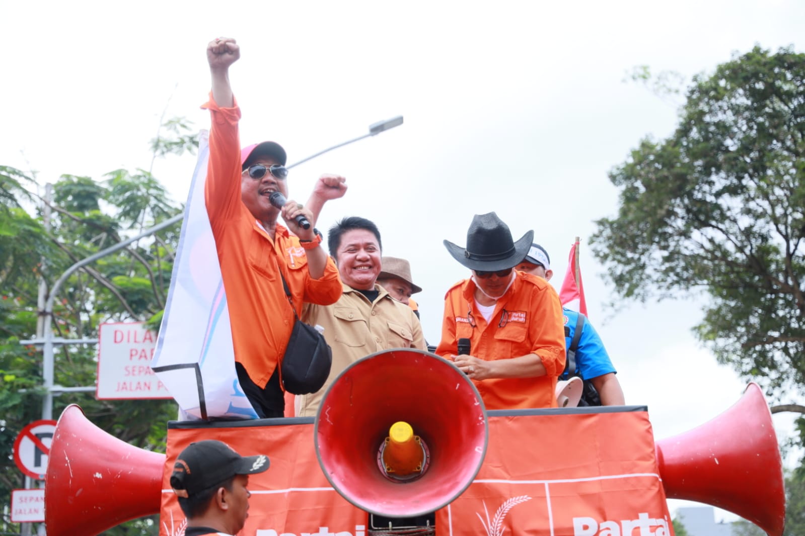 Tanpa sungkan, Ia bahkan naik mobil podium yang disediakan demi menyapa para buruh.